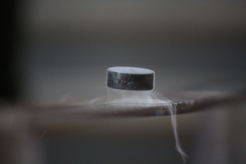 A piece of superconducting material (YBCO), cooled to below its superconducting transition temperature with liquid nitrogen levitates above a magnetic track. This is an example of the Meissner effect - the weak magnetic field from the nearby permanent magnets can be expelled by the superconductor. This is because current flows in the surface of the material, generating a perfect mirror repulsive magnetic field i.e. the superconductor is a diamagnet.