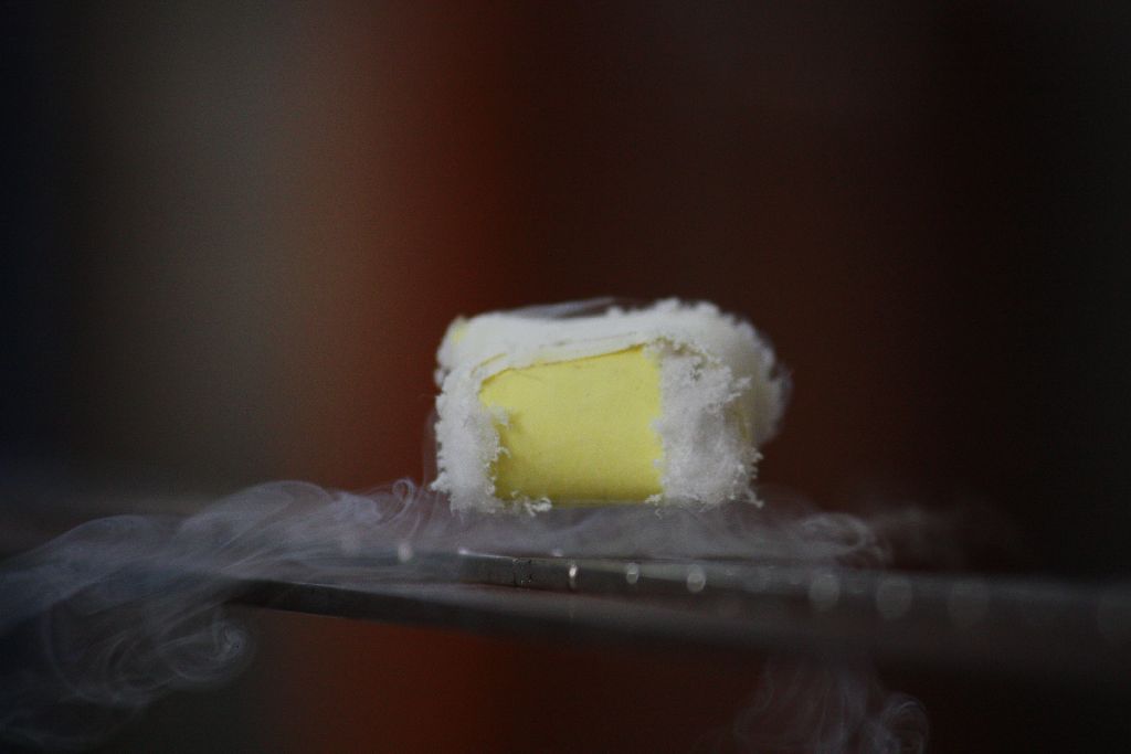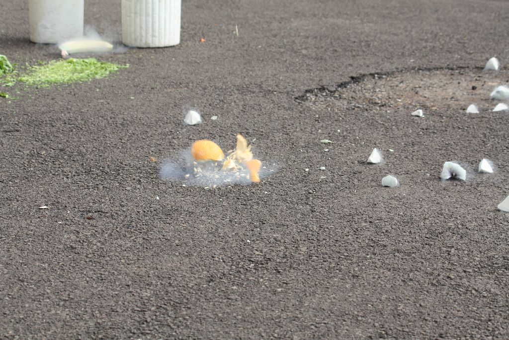 Shattering an orange frozen with liquid nitrogen to -196°C.